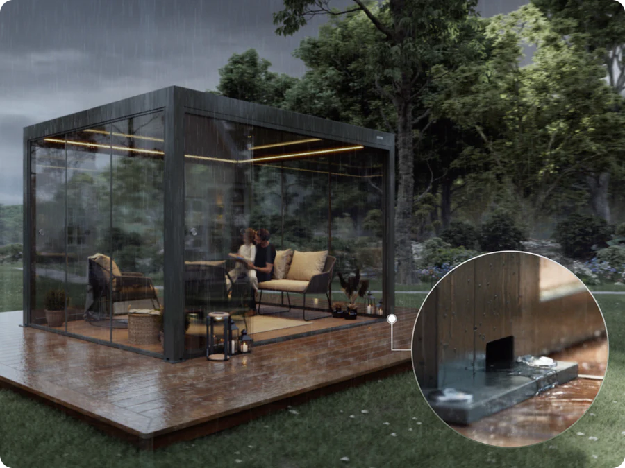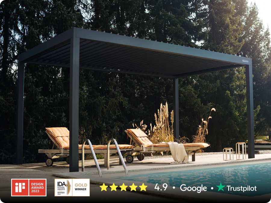 At PERGOLUX, we have created a pergola with a louvered roof with slats that can open and close. We have added in a water drainage system to keep you dry. And we have designed all of the accessories needed to you enjoy your pergola, regardless of the weather.