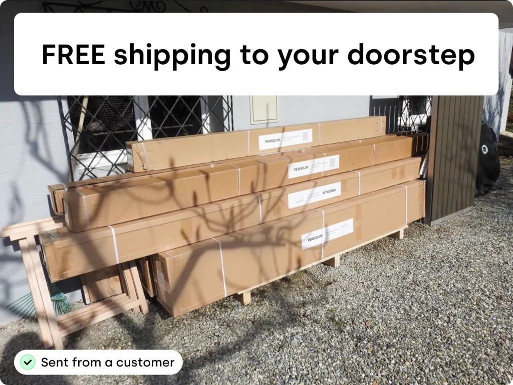 Shipping is free for each pergola purchase. A delivery team will schedule an appointment and then unload your PERGOLUX boxes directly to your front door within 5-15 days after shipping. No forklift required.